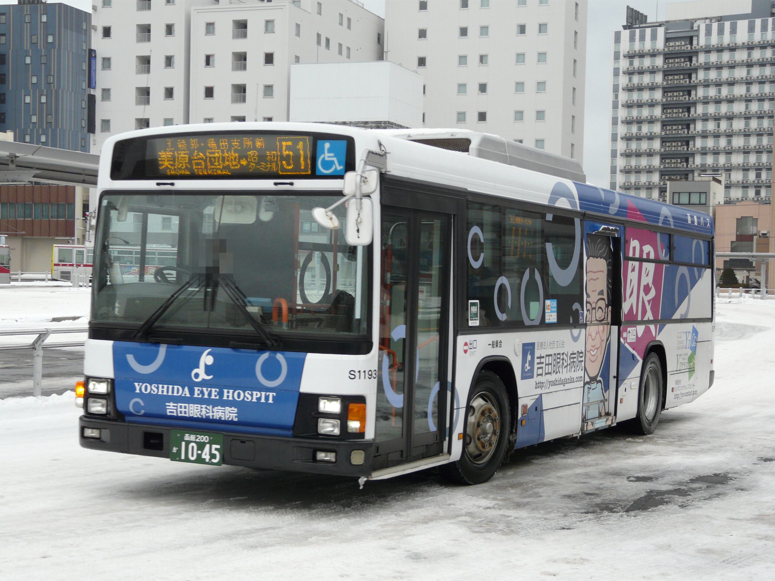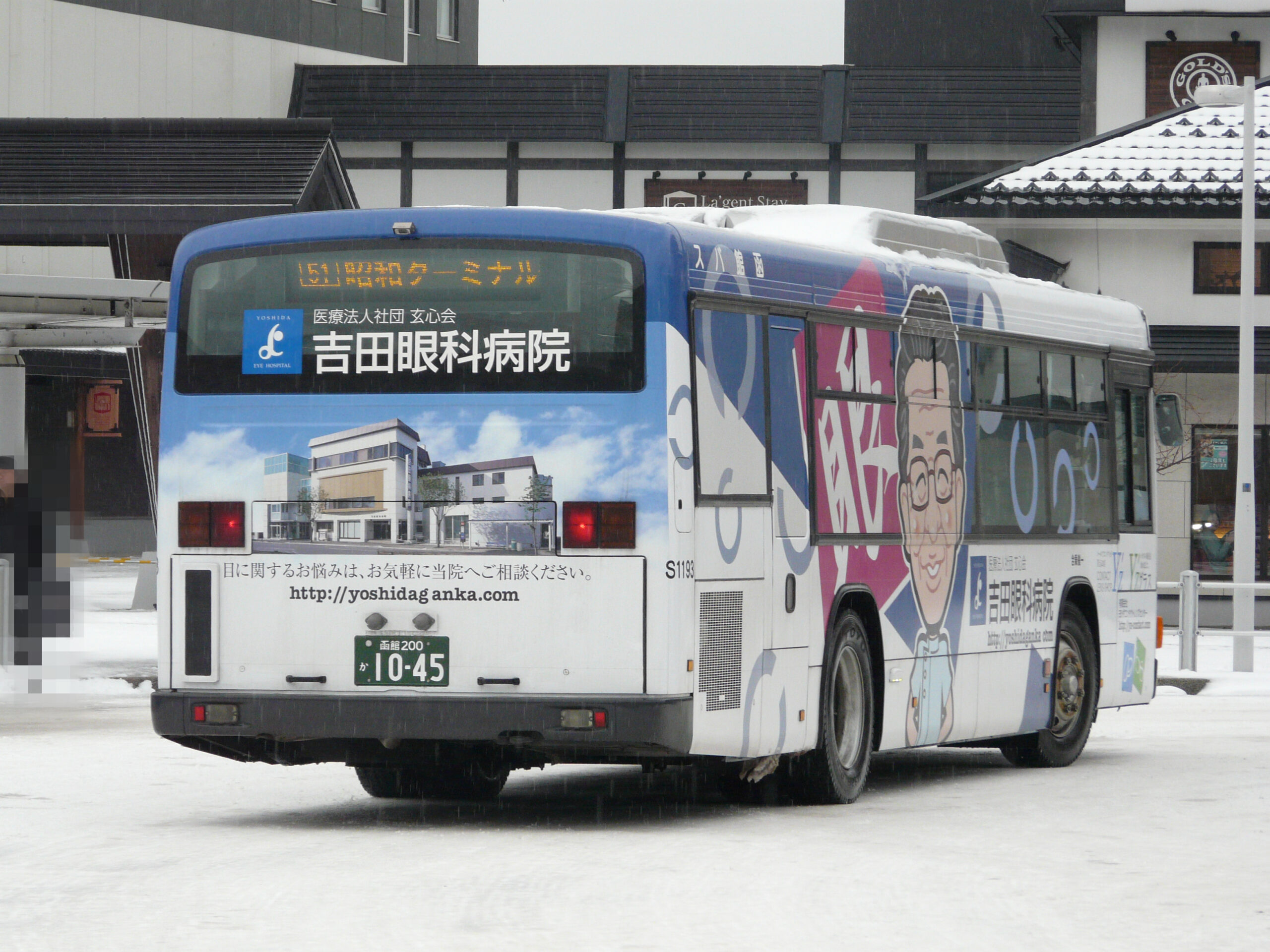 函館バス いすゞ S1193 (PJ-LV234L1) コメントを残す 2007年に京浜急行バスが導入し,2025年に函館バスが導入した。 前中引戸・黒枠逆T字型窓のエルガノンステップバスで, 軸距4.8メートルの短尺大型エアサス車である。 2025年12月に函館駅前にて撮影。 吉田眼科病院 の広告バスとなっている。 側面表示器は戸袋の前に設置され,経由地が5カ所表示できるようになっている。 〈参考までに:京浜急行バス時代の車番→ M1763〉 〈おまけ:過去に撮影した写真〉 (この写真は匿名様からの提供です。撮影日:2025年5月に市立函館病院前にて)