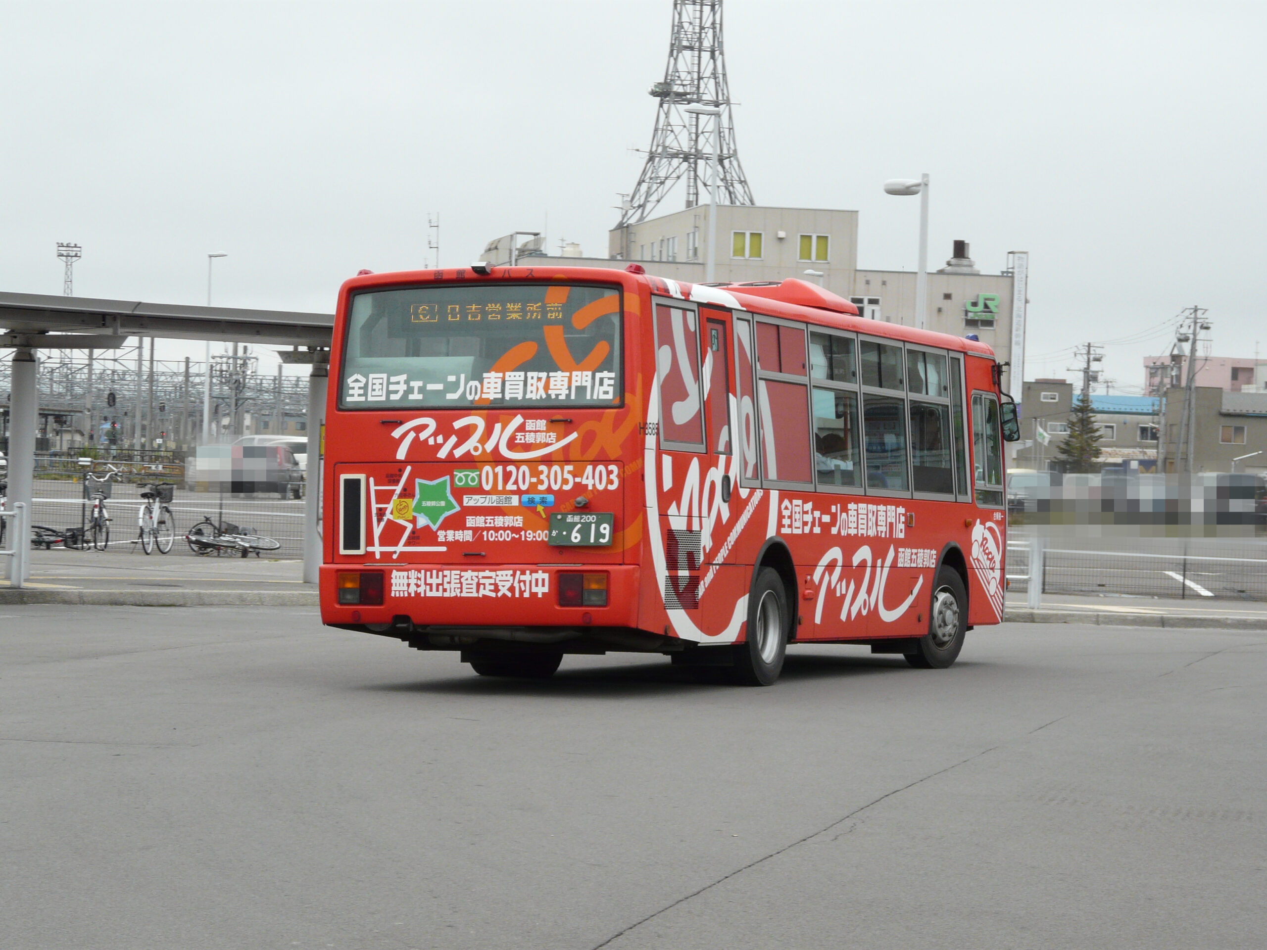 後部は 函館三菱ふそう自動車販売株式会社 の広告バスで,他にも3台(S3607・S3615・S3633)存在している。