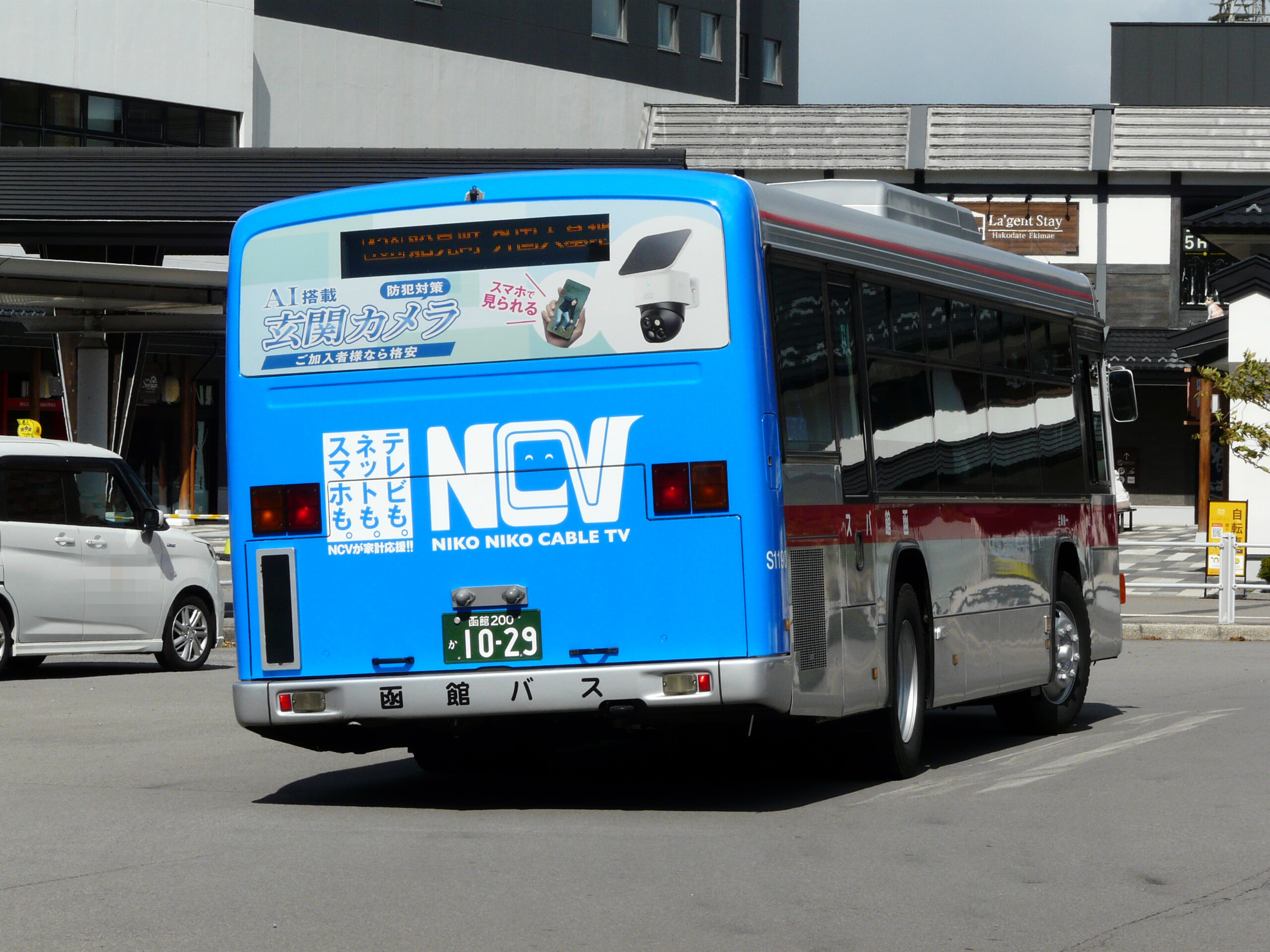 函館バス いすゞ S1190 (PJ-LV234L1) コメントを残す 2007年に京浜急行バスが導入し,2024年に函館バスが導入した。 前中引戸・黒枠逆T字型窓のエルガノンステップバスで, 軸距4.8メートルの短尺大型エアサス車である。 2025年9月に函館駅前にて撮影。 後部は NCV の広告バスで,他にも3台(H1188・T3602・S4492)存在している。 側面表示器は戸袋の前に設置され,経由地が5カ所表示できるようになっている。 〈参考までに:京浜急行バス時代の車番→ M1760〉 〈おまけ:過去に撮影した写真〉 (この写真は匿名さんからの提供です。撮影日:2024年10月に函館駅前にて) 2025年4月に函館駅前にて撮影。