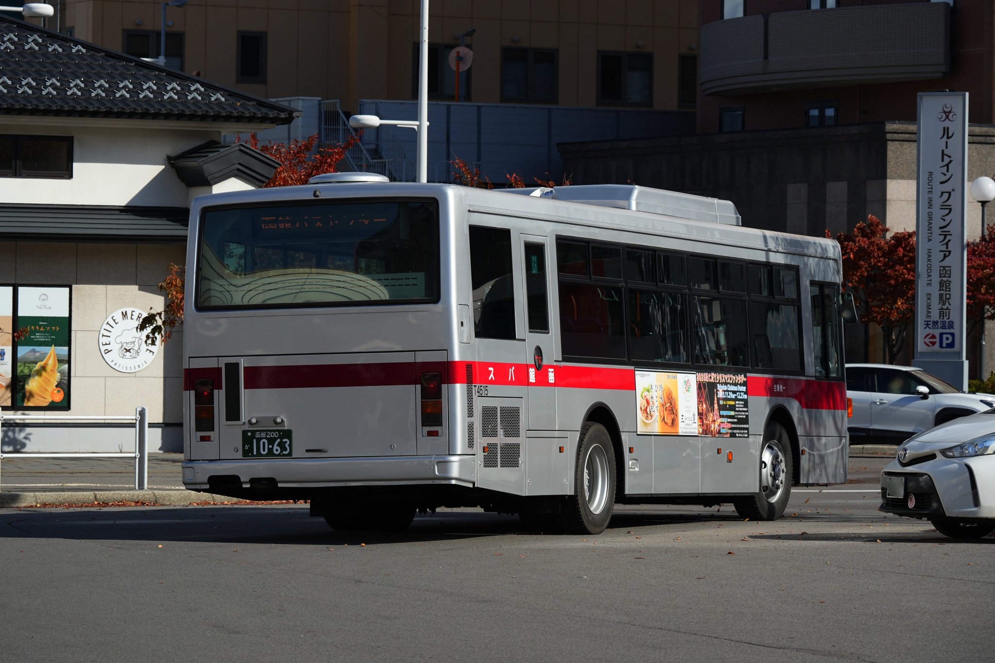 函館バス 日産ディーゼル T4515 (PKG-RA274KAN) コメントを残す (この写真は匿名様からの提供です。撮影日:2025年11月に函館駅前にて) 2009年に京浜急行バスが導入し,2025年に函館バスが導入した。 前中引戸・黒枠逆T字型窓のスペースランナーRAノンステップバスで, 軸距4.8メートルの短尺大型エアサス車である。 側面表示器は戸袋の前に設置され,経由地が5カ所表示できるようになっている。 〈参考までに:京急バス時代の車番→ A7930〉