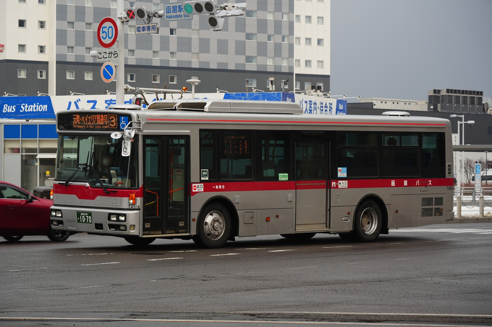 函館バス 日産ディーゼル T4514 (PKG-RA274KAN) コメントを残す (この写真は匿名様からの提供です。撮影日:2026年2月に函館駅前にて) 2009年に京浜急行バスが導入し,2026年に函館バスが導入した。 前中引戸・黒枠逆T字型窓のスペースランナーRAノンステップバスで, 軸距4.8メートルの短尺大型エアサス車である。 側面表示器は戸袋の前に設置され,経由地が5カ所表示できるようになっている。 〈参考までに:京急バス時代の車番→ A7929〉