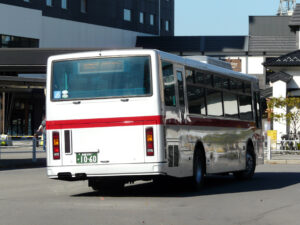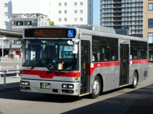 函館バス 日産ディーゼル H4510 (PKG-RA274PAN) コメントを残す 2007年に東急バスが導入し,2025年に函館バスが導入した。 前中4枚折戸・黒枠逆T字型窓のスペースランナーRAワンステップバスで, 軸距5.8メートルの長尺大型エアサス車である。 2025年10月に函館駅前にて撮影。 側面表示器は前扉の横に設置され,経由地は5カ所表示できるようになっている。 また,グリーンガラスを採用している。 〈参考までに:東急バス時代の車番→ NI8725〉