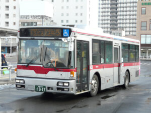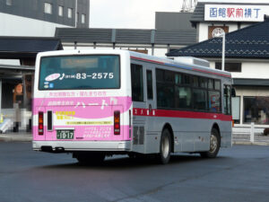 前中引戸・黒枠逆T字型窓のエルガノンステップバスで,
